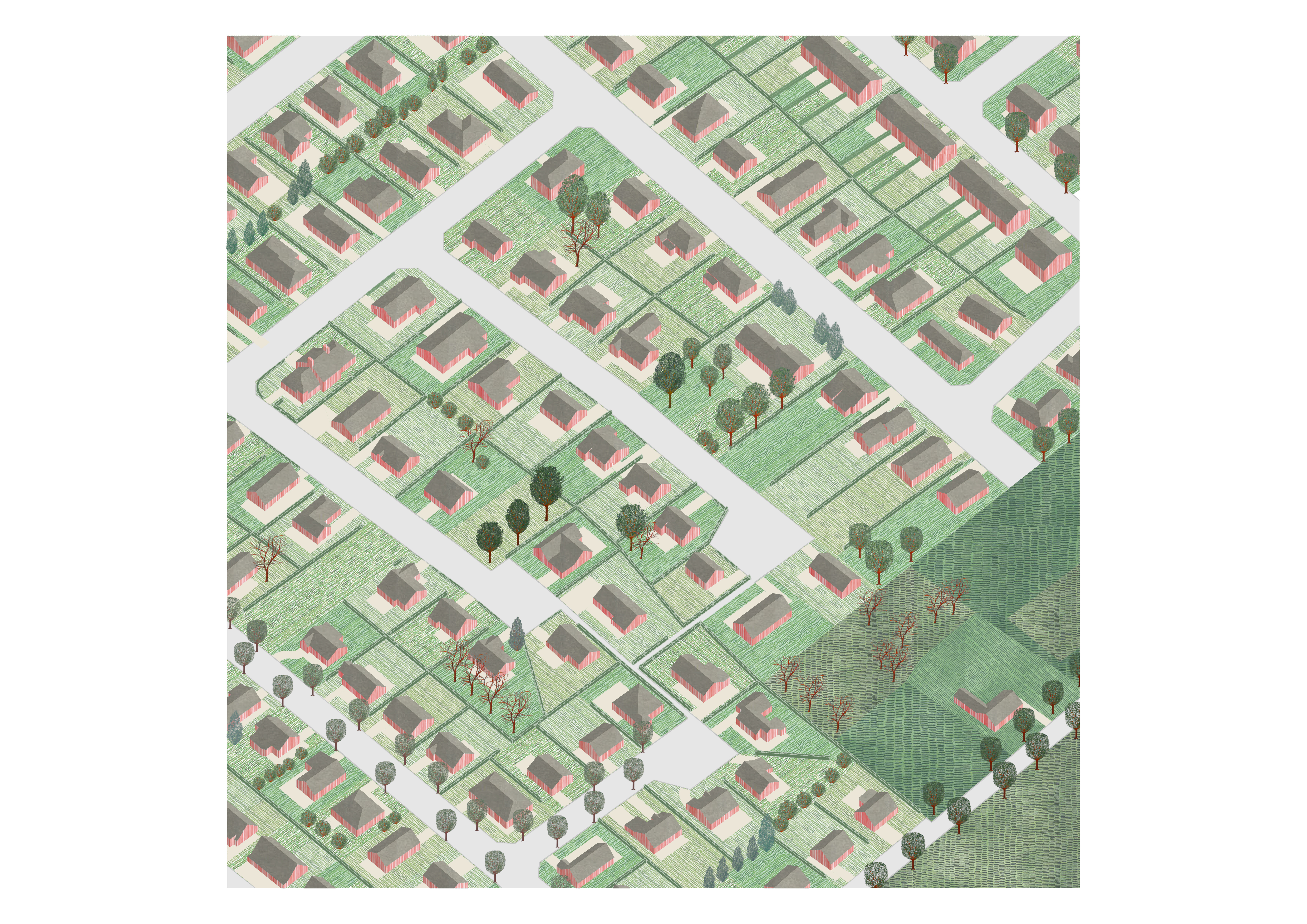 Het bijzondere aan de test van Bovenbouw, LABO S en Orientes is dat ze op deze generieke uitsnede de potentiële ruimtelijke transformatie onmiddellijk koppelden aan een financiële logica om geen moeilijk te realiseren ideaalbeelden, maar wel een incrementele operationalisering uit te tekenen. Het resultaat is een strategie die, ook zonder dat één grote projectontwikkelaar of overheid grote stukken grond opkoopt, tot een forse verdichting kan leiden, rekening houdend met het DNA van de verkaveling, de typische structuur en perceelgroottes en met het oorspronkelijke idee van wonen in een luwere, parkachtige omgeving en toch dichtbij de stad.